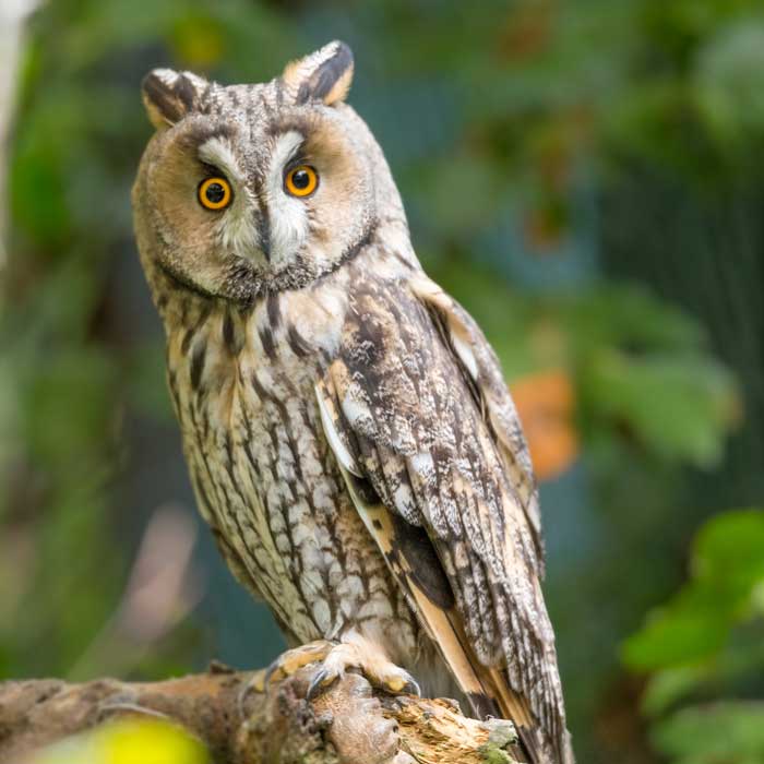 - Besondere Merkmale: Mittelgroße Eule mit auffälligen Federohren, orangefarbenen Augen, braun-grau gemustertem Gefieder mit dunklen Flecken und Streifen, herzförmigem Gesicht.